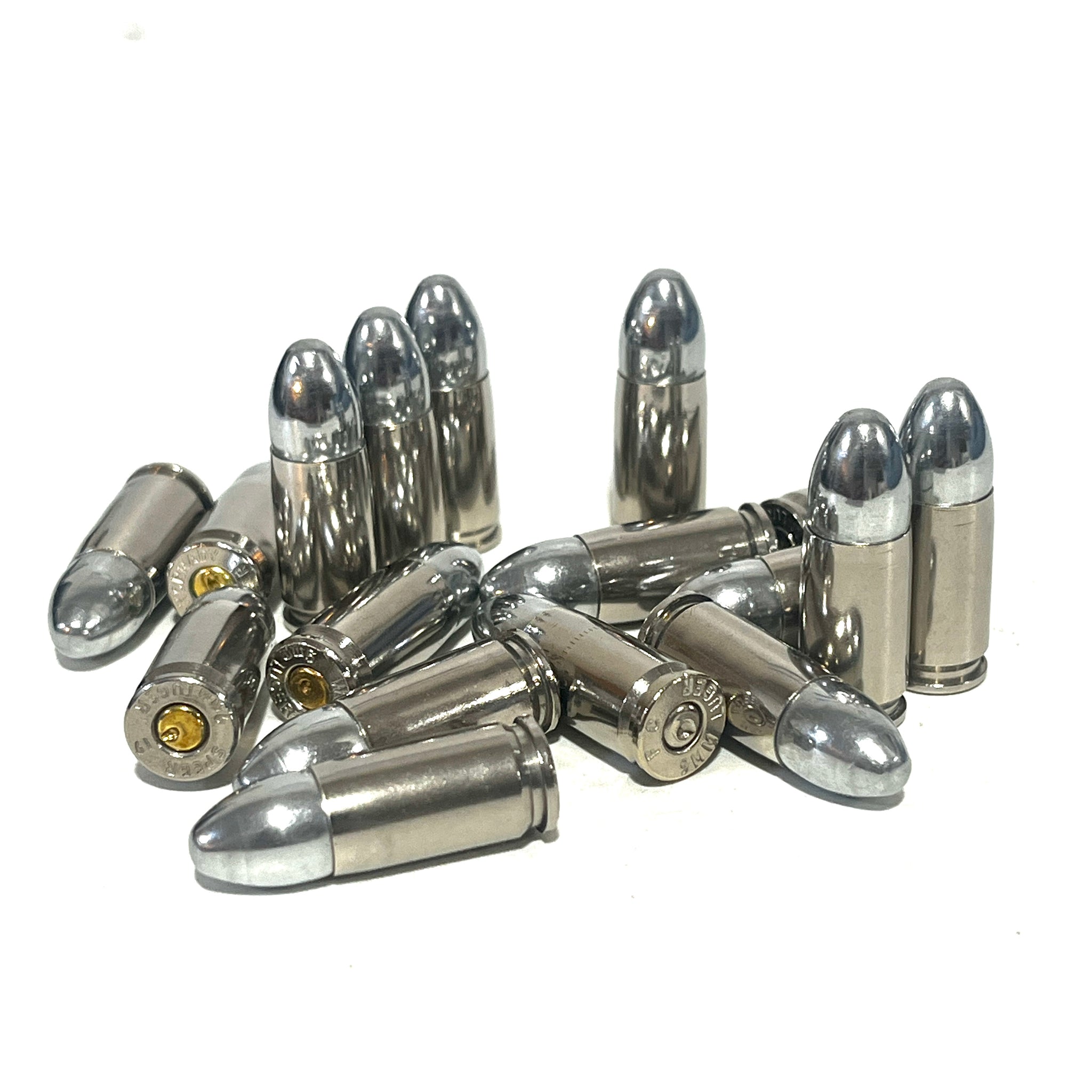 We make our dummy 9mm rounds from real, once-fired empty nickel casings that have been recovered, cleaned, inspected and polished. We insert a real, authentic new 9mm round-nose silver projectile into the casing.